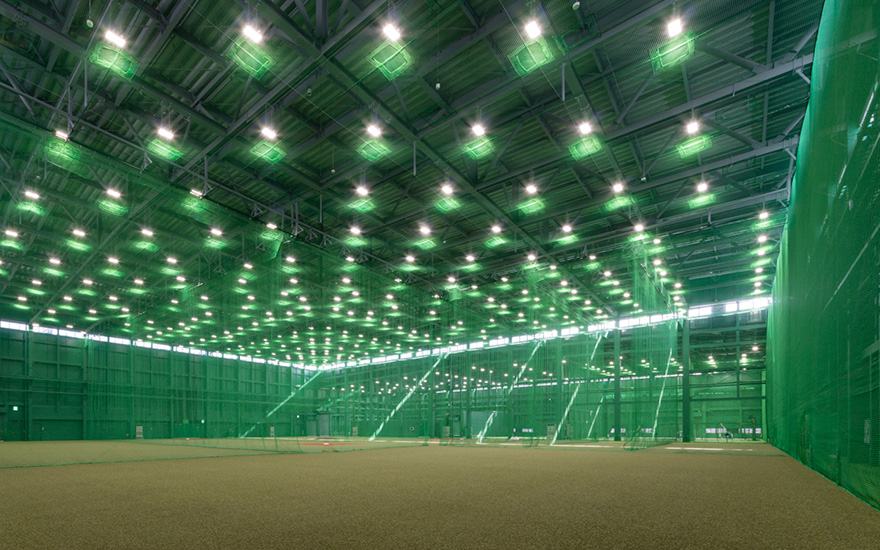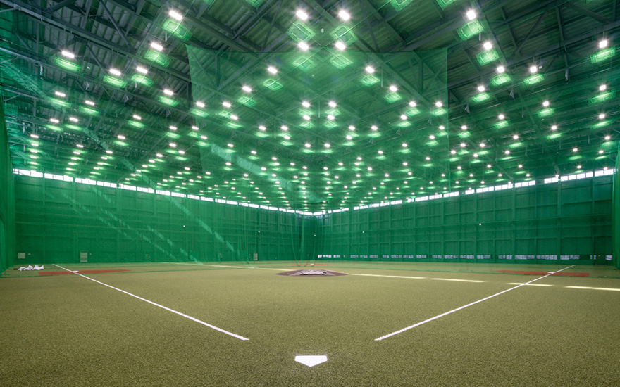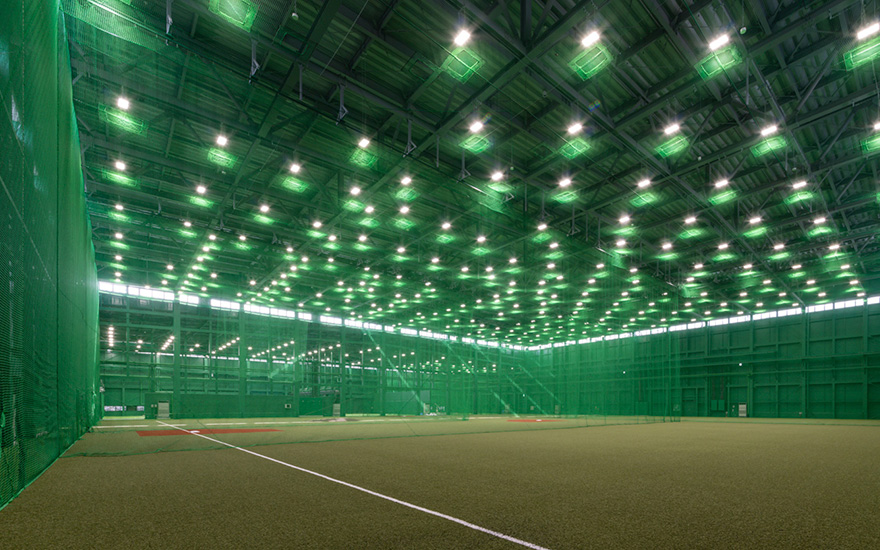 日本有数の約60m×約90mの広さを誇る室内練習場。甲子園球場室内練習場の約1.5倍の建築面積で、天井高も約3m高い約19m。ボール自動収集機能付きの打撃マシーン3レーン含む6レーンの打撃練習場や、最新鋭の分析機器を搭載したブルペン等、天候を気にせずに選手たちが野球に没頭できる環境が整いました。
